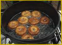- Deep-fry Doughnuts or Fish - Pour vegetable oil into the oven so it is 2 inches deep. Set this over coals to heat. Test the oil temperature by dropping in a tiny piece of dough or fish - if it sputters and fizzes, it's hot enough. Fry the doughnuts until they're golden brown or fry your fish just like they do french fries at McDonald's - make sure you have a stick to pick out the doughnuts or a slotted metal spoon to remove the fish.